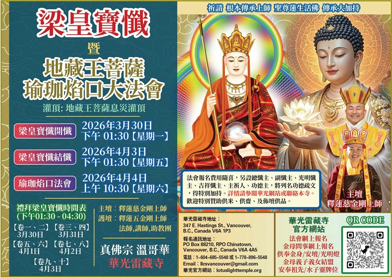 法會時間:2026年4月4日(六) 10:30am 地藏王菩薩瑜伽焰口法會