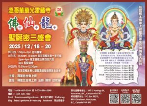 祈請根本上師蓮生佛傳承大加持 溫哥華華光雷藏寺 恭請 住持蓮慈金剛上師 主持密法營 上師、法師、講師、助教團護持 佛王仙王龍王聖誕密三營 加拿大溫哥華華光雷藏寺佛王仙王龍王聖誕密三營 18日(四) 1:30pm-3pm 金母寶懺第三壇 19日(五) 10:30am-12:30pm 龍王寶瓶法第一至三壇 19日(五) 2pm-4pm 龍王寶瓶法第四至六壇 / 6pm 聖誕餐會 20日(六) 10:30am-12:30pm 龍王寶瓶法第七壇圓滿壇暨慈悲放生法會   意義: 世道艱難,無常處處。今值歲末新舊交替之際,金母降旨啟建七壇「瑤池金母收圓寶懺」,至誠懇請眾生之母南摩無極瑤池金母大天尊加被含靈,逢兇化吉。撥運轉命。滅罪消災。祛病延年。光明健康。平安吉順。 龍王寶瓶法是祈願大祕密法,可求福祿、求財、事業、婚姻、子女等 放生功德可增福增壽、消災解難、祛病、消業等。 (註:海外同門請購龍王寶瓶者,需自修七壇,本寺代加持及獻寶瓶)   一切報名費用隨喜,欲報名放生法會主祈、功德主及贊助放生物等,請聯絡本寺。 報名通訊地址: PO Box 88210, RPO Chinatown, Vancouver, B.C., Canada V6A 4A5 電話:604-685-5548  傳真:604-605-1002 Email:llcsvancouver@gmail.com 下載報名表 法會贊助   本寺2026丙午年安太歲光明燈祖先蓮位,供佛安燈接受報名。下載報名表